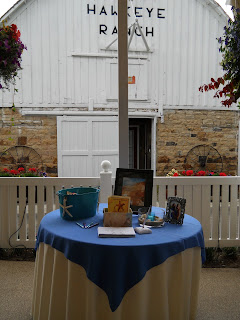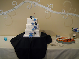 Their head table stood out as a sea of blue tablecloths, similar sand and shell centerpieces, more candles, and a beautiful net of starfish! Their wedding cake also tied in the blue colors of the ocean! It had starfish cascading down the front (pictured below). They also had a groom’s cake with the Harley Davidson logo since the groom rides motorcycles! Their guest book table had fans for the warm weather and papers that told the story of the starfish. It was so much fun to have the beach be brought to Fort Collins! Congratulations to the two of you! We loved being a part of your big day!