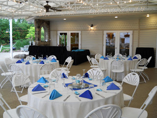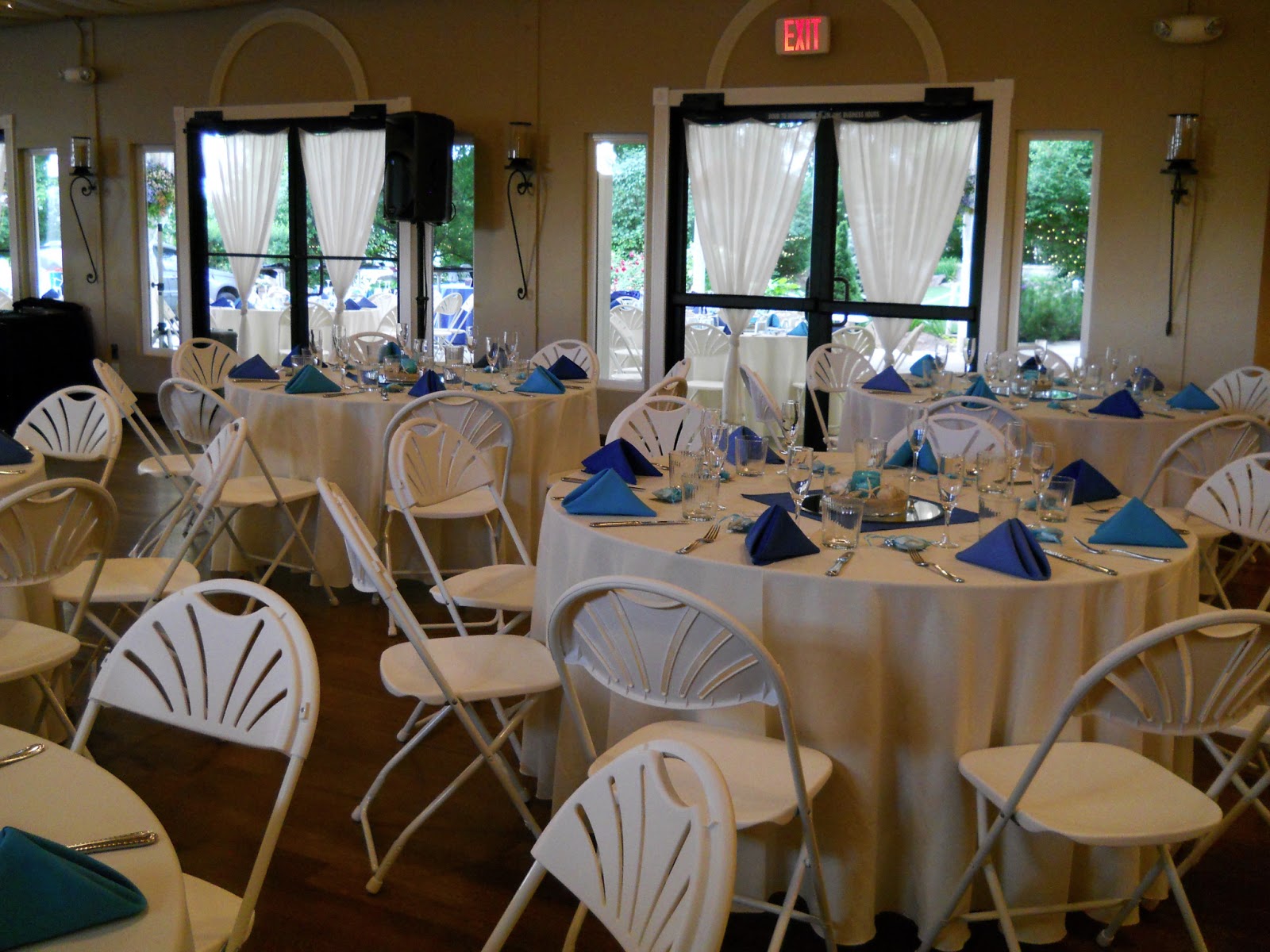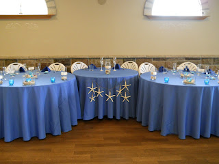 Recently, we had a couple who decided to bring their love of the beach and ocean to our Colorado venue! This had something to do with their engagement which happened at a waterfall in Hawaii. The bride said that as soon as they met, she knew he was the one and they were so excited to finally tie the knot! Every detail of their wedding reflected their love of the ocean and their engagement spot! They used napkins in various shades of blue at each guest table with white linens. Their centerpieces consisted of sand-filled bowls with shells and stones with a candle in the center. Their favors also offered guests a few candies, candles, and shells from the beach! Take a look at the room layout!