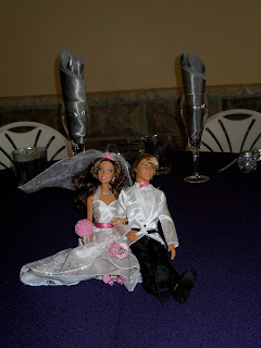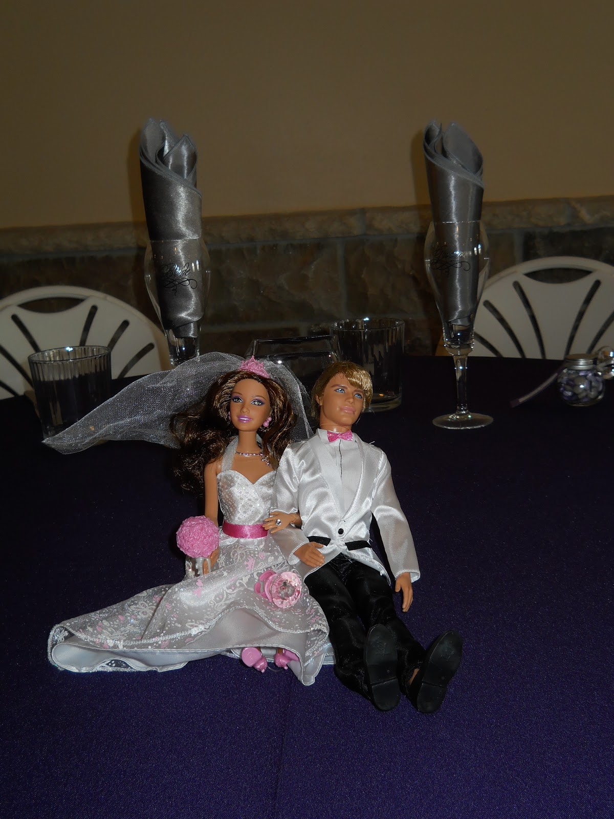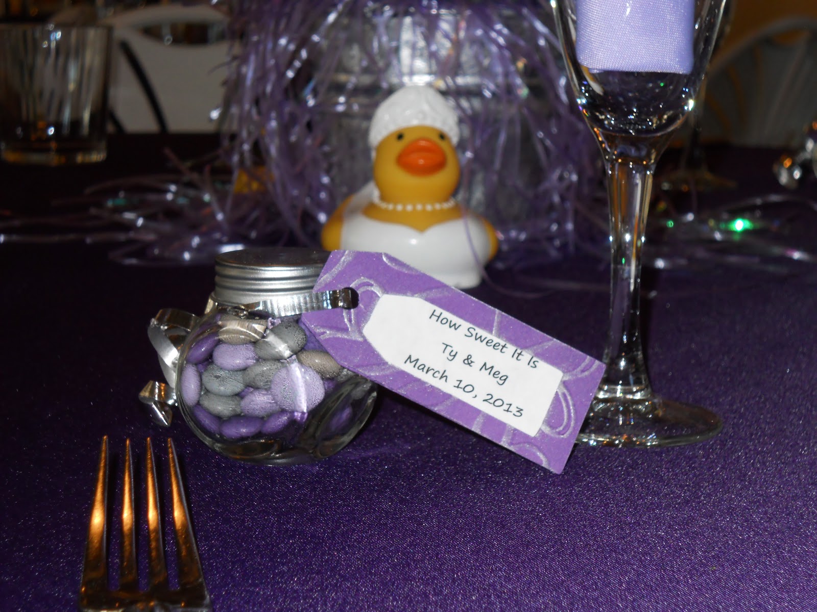Their centerpieces were really fun, too! They had Mr. and Mrs. Potato head, all dressed up in a tux and gown, rubber ducks as pictured here, and Barbie and Ken who were also getting married! These toys were surrounding cute little purple potted flowers of orchids or pansies. Their favors were gray, lavender, and eggplant colored m&ms in cute little jars! How cute are they??