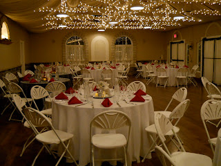 One of the color combinations that we have really enjoyed this past winter was red, white, and silver! Done in the right way with red accents, this combination can make an evening wedding come alive! A couple weeks ago, we had a wedding that really popped with these colors! From the centerpieces to their memory table, the colors were seen throughout and the addition of pops of red tied the whole room together! One of my favorite things about this event was their centerpieces! The family made every single one of them! Instead of a mirror as the base, they used chargers spray painted in silver. They then had little vases that they also spray painted silver on top with three little tea light candles around them to add a nice glow. Inside the vases were beautiful arrangements of white silk flowers with little sparkles of red to tie in their accent color! Check them out!